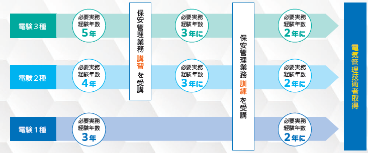 実務経験の必要年数は、【電験第1種】3年、【電験第2種】4年、【電験第3種】5年です。